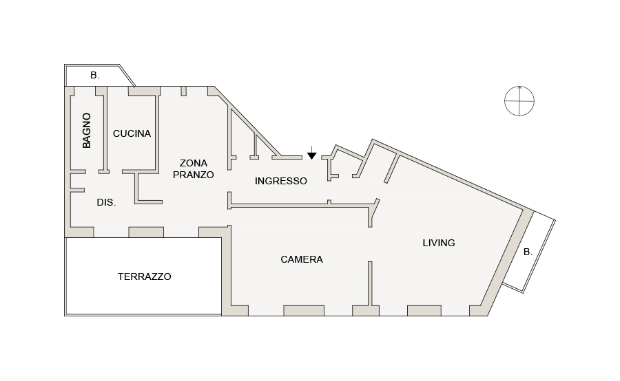 Come mostrato nel progetto presente nella galleria immagini, l’abitazione può essere riorganizzata in chiave moderna, con zona giorno direttamente affacciata sul terrazzo e master room ben separata dal resto degli ambienti.